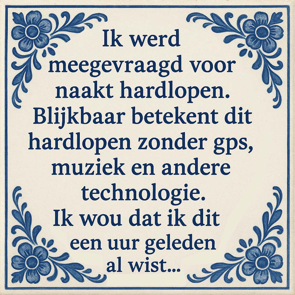 En dus heb ik nu sinds een paar weken al mijn meldingen uit staan. ook mijn horloge trilt niet meer telkens en ik doe hem nu niet eens om. Ik weet heus wel wanneer ik voldoende stappen heb gezet. Zelfs hardlopen ga ik af en toe zonder horloge doen. Ik las online dat ze daar een naam voor hebben: Naked Running (Naakt hardlopen). Vandaar mijn mooie tegeltje boven dit artikel, want ik krijg daar toch andere beelden bij. Nee, op die manier ga ik nooooit hardlopen. ?